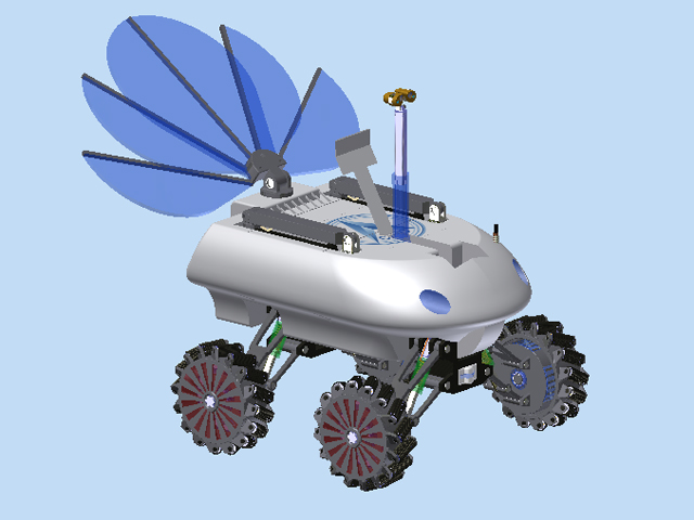 我院数字化作品“月球车”,以高服役性能、高可靠性为主要设计思想,设计新颖,通过预赛、答辩、现场操作三个比赛环节,获得评委一致认同和好评,夺得本届大赛特等奖。作品“月球车”应用Autodesk Inventor 三维设计软件设计月球车模型,利用运动仿真和应力分析优化模型设计,制作完成了月球车仿真动画。设计中注重使用当今的前沿技术(如永磁直流电机、全向轮、CIGS薄膜电池以及燃料电池等),为未来月球车构建了一个技术框架,目的在于设计出能够满足未来数年内登月计划的月球车。