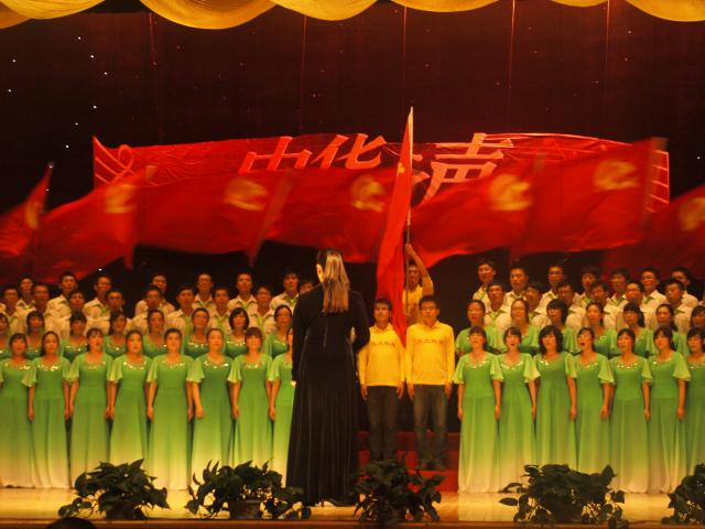 我院代表队由2011级的120位合唱队员和40位旗手组成,指挥由郝婕老师担任。同学们着装整齐,精神焕发,唱歌时而温婉柔情,时而慷慨激昂;指挥激情洋溢,铿锵有力;舞蹈动作到位,感情充沛;全场党旗飘动,人心振奋,整个演出精彩纷呈,美妙绝伦。我院常务副院长洪军教授、分党委副书记訾艳阳教授、副院长李兵教授也与同学们同台演出,现场洋溢着浓浓的师生情谊。我院代表队以优美柔和、富有激情的校歌《为世界之光》和细腻激昂、情感深切的《迎风飘扬的旗》赢得了全场观众的热烈掌声。经过在场专业评委们的评审, 最终以98.90分荣获了本次比赛的第二名。