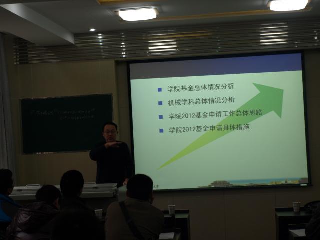 科研院王文副处长介绍了近几年来学校基金申报情况,并就565net必赢客户端基金申报情况在校内进行了分析比较,最后对2012年基金项目申请政策进行了解读。徐光华副院长介绍了565net必赢客户端近年来基金总体情况以及机械学科基金申报情况,介绍了我院2012年基金申请工作的总体思路,并对2012年565net必赢客户端基金申请的具体措施和安排进行了部署,希望各系所强化组织,认真落实申请指标,深入挖掘基金申报资源,努力提高基金申请质量,严格遵守基金申报工作的具体要求和进度安排,鼓励全院教师再接再厉,争创佳绩。