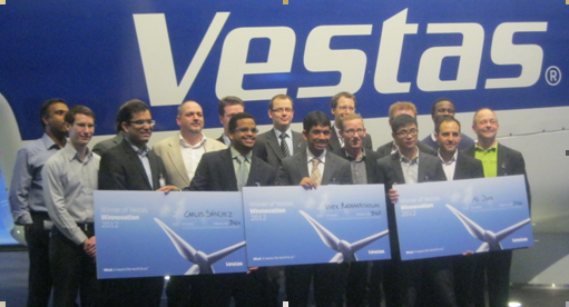 维斯塔斯全球风能挑战赛是由世界风能技术的领先者维斯塔斯(Vestas)公司发起,自2008年来,每年举办一次。今年挑战赛的主题围绕产品研发,质量控制和供应量管理,吸引了包括哈佛商学院,麻省理工学院等世界各地具有工科背景的优秀研究生。在复赛中选手们随机组合在一下午时间内完成关于PPAP应用难题的第二轮挑战,在第二轮表现最好的两个队,和前两轮在产品研发,质量管理,供应量管理各自领域表现最好的个人临时组成第三团队进入第三轮决赛,在两个小时内完成关于降低成本,保持质量的最后挑战。由胡坚 (Product Development, Xi'an Jiaotong University),Vivek Radhakrishnan (Supply Chain Management, Massachusetts Institute of Technology),Carlos Alberto Peña Sánchez (Quality in Production, University of North Texas)三人组成的团队,通过激烈角逐,在众多队伍中脱颖而出,赢得了维斯塔斯2012全球风能挑战赛的冠军。
