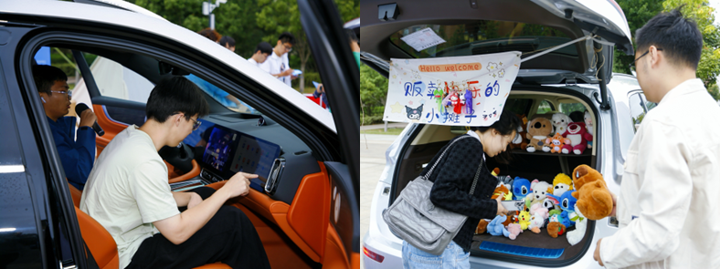 与此同时,分会场的活动也同样热闹非凡。展车体验区和后备箱集市区吸引了大批同学驻足,大家近距离接触赛力斯集团的最新车型,体验前沿汽车科技的魅力。后备箱集市的商品琳琅满目,毛绒玩具、动漫周边等吸引了众多同学选购。摊主热情推介,现场人流不断,气氛热烈。