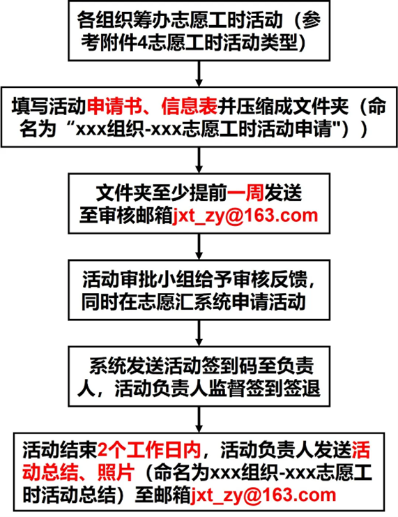 4、各活动负责人请在当天活动结束的2个工作日之内提交一篇500字活动总结及5张活动照片至学院团委志愿服务中心邮箱jxt_zy@163.com,活动总结和活动照片统一以压缩文件夹(命名为:“xxx组织-xxx志愿工时活动总结”)的形式提交。