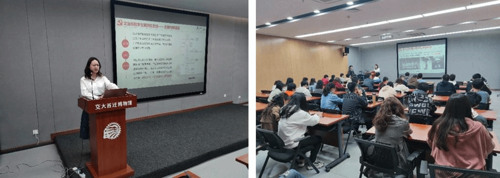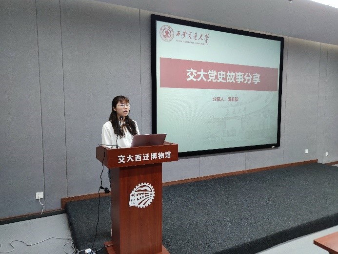 紧接着文治书院学生第四党支部阮唯欣同学进行了交大党史故事分享,介绍了交通大学第一个支部成立、交大西迁以及彭康校长等故事。