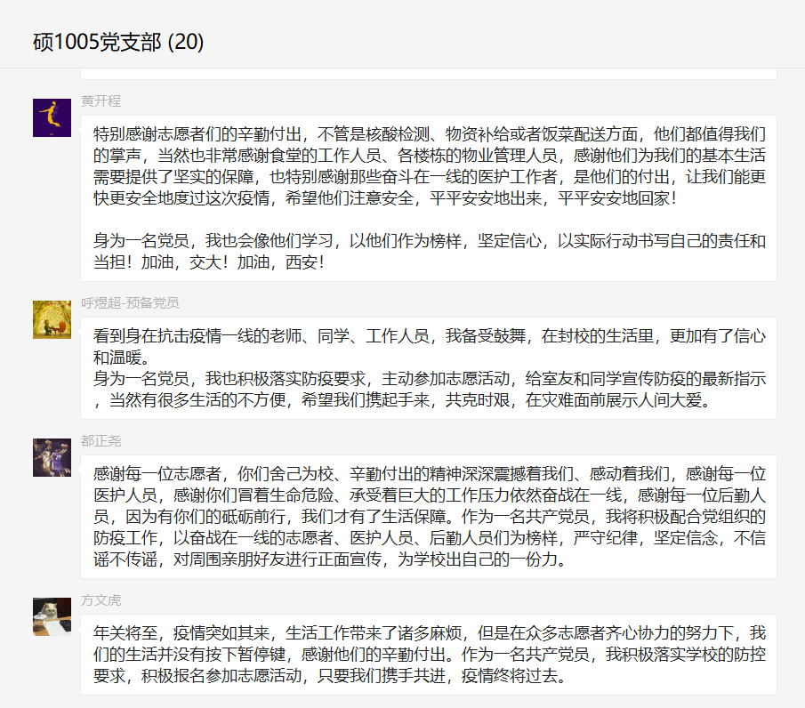朱天伦同志分享道:“21年末,病毒袭击西安,古城紧闭、三秦不安,广大医护人员等战斗在抗疫一线的英雄们为一千三百万西安市民筑成了一道钢铁长城,保护着广大人民群众的健康。在创新港,也有一批医护人员、物业人员、后勤人员和志愿者不辞辛苦、不惧危险地为交大师生服务,将病毒挡在墙外,守护着一方土地。我作为研究生党员,为了发扬带头作用,贯彻为学生服务的宗旨,在隔离期间主要负责了565net必赢客户端必需生活物资的需求收集、集中采购与分发工作,还参与了一些其他志愿活动,尽我所能地在特殊时期履行好党员职责,服务好我院学生。我认为,每个党员都是一面旗帜,越是特殊时期越是发挥我们的作用的时候,关键时刻挺身而出才是党员本色。”