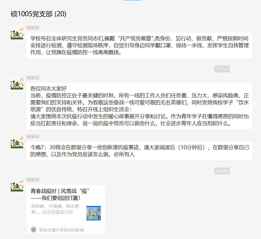 为致敬抗疫中奋战一线可爱可敬的无名英雄,发扬我校学子“饮水思源”的优良传统,硕1005党支部于2022年1月6日19:00在线上召开了“感恩抗疫中的无名英雄”组织生活会。旨在分享本次抗疫行动中发生的暖心故事,并去深刻认识作为青年学子在懂得感恩的同时也应当扛起责任和使命。