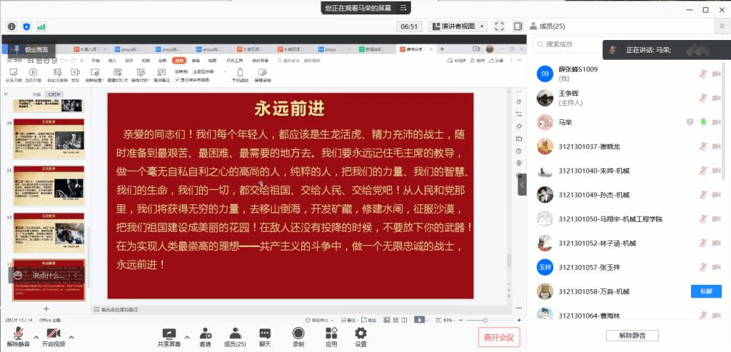 接下来由刘冬生同志带领大家一起学习了2022新年贺词。和新年贺词“金句”迭出,充满信心与力量,充满责任与担当,充满情怀与梦想,温暖人心、感人至深、催人奋进。在新年伊始,我们一起感受习主席在新年贺词中的这份深情,在温暖和祝福之中一起迎接新的开始和更加美好的未来。刘冬生同志在分享时说道:作为一名学生党员,尤其是当下疫情时期,我们更应该以身作则,争做志愿者,帮助身边的同学;同时我们也应该具有广阔的胸襟和开阔的视野。站在新的历史起点上,我们定能战胜各种艰难险阻,创造更加灿烂的辉煌。