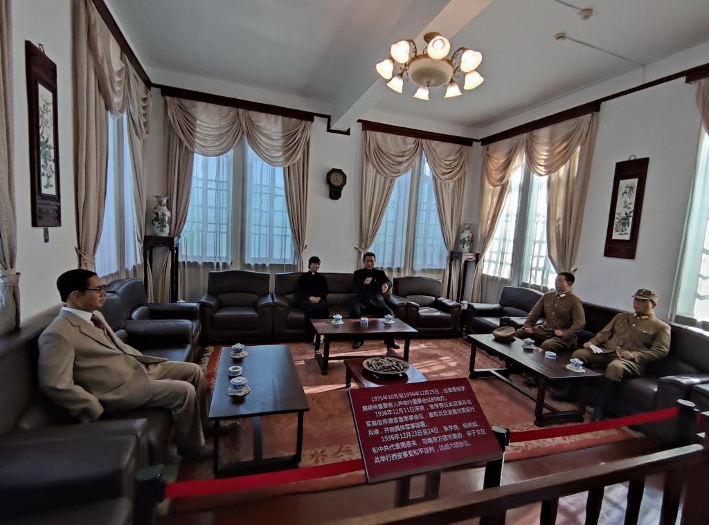 讲解员解说结束后,同学们自行依次参观了张学良将军公馆的三幢小楼,其中的A楼是在处理西安事变的时候,周恩来、秦邦宪、叶剑英三位中共中央代表居住过的地方。B楼陈列了张学良将军的一生的历史和他的遗物。C楼则是张学良及其眷属居住地,也是西安事变酝酿、发生及和平谈判的重要场所,一楼的会议室厅生动再现了1936年12月24日西安事变和平谈判的历史瞬间。由周恩来、张学良、杨虎城代表西安方面与宋美龄与宋子文代表的蒋介石方面进行了两天的谈判,最后达成六项协议,为西安事变和平解决奠定了基础。